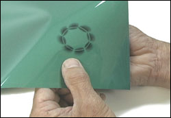 This green plastic sheet changes color, becoming black, when penetrated by a magnetic field perpendicular to its surface. It is useful for viewing magnetic poles, fields, and transitions. Color change occurs at a low field strengh (10 to 50 gauss), and remains after the field is removed, but can be "erased" by stroking with a magnet, or reset by exposure to another magnetic field. Unlike some other magnetically sensitive films of coarser grain, this film has very high resolution, and easily shows details less than ten thousandths of an inch wide (less than half the width of a typical pencil line).